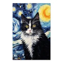 Tuxedo Cat Starry Night Poster | Drinkable Black And White Tuxedo Cat Painting | Van Gogh Starry Night With Tuxedo Cat Able Art