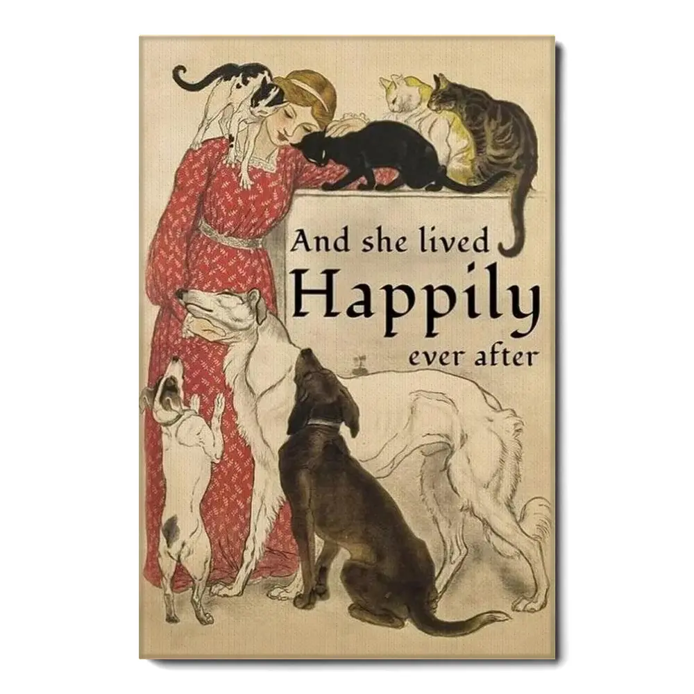 And She Lived Happily Ever After Vintage Poster Girl With Her Cats And Dogs Poster Cats And Dogs Art Print Animal Lover For Her