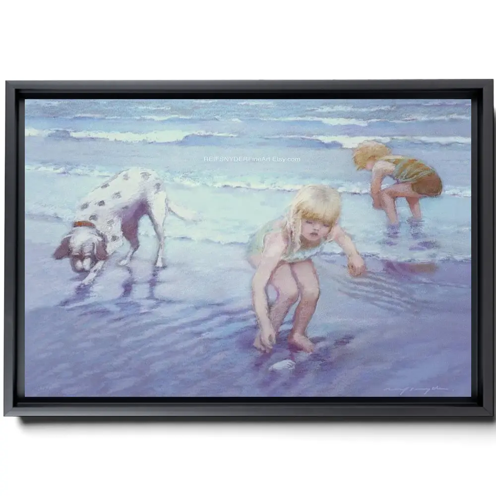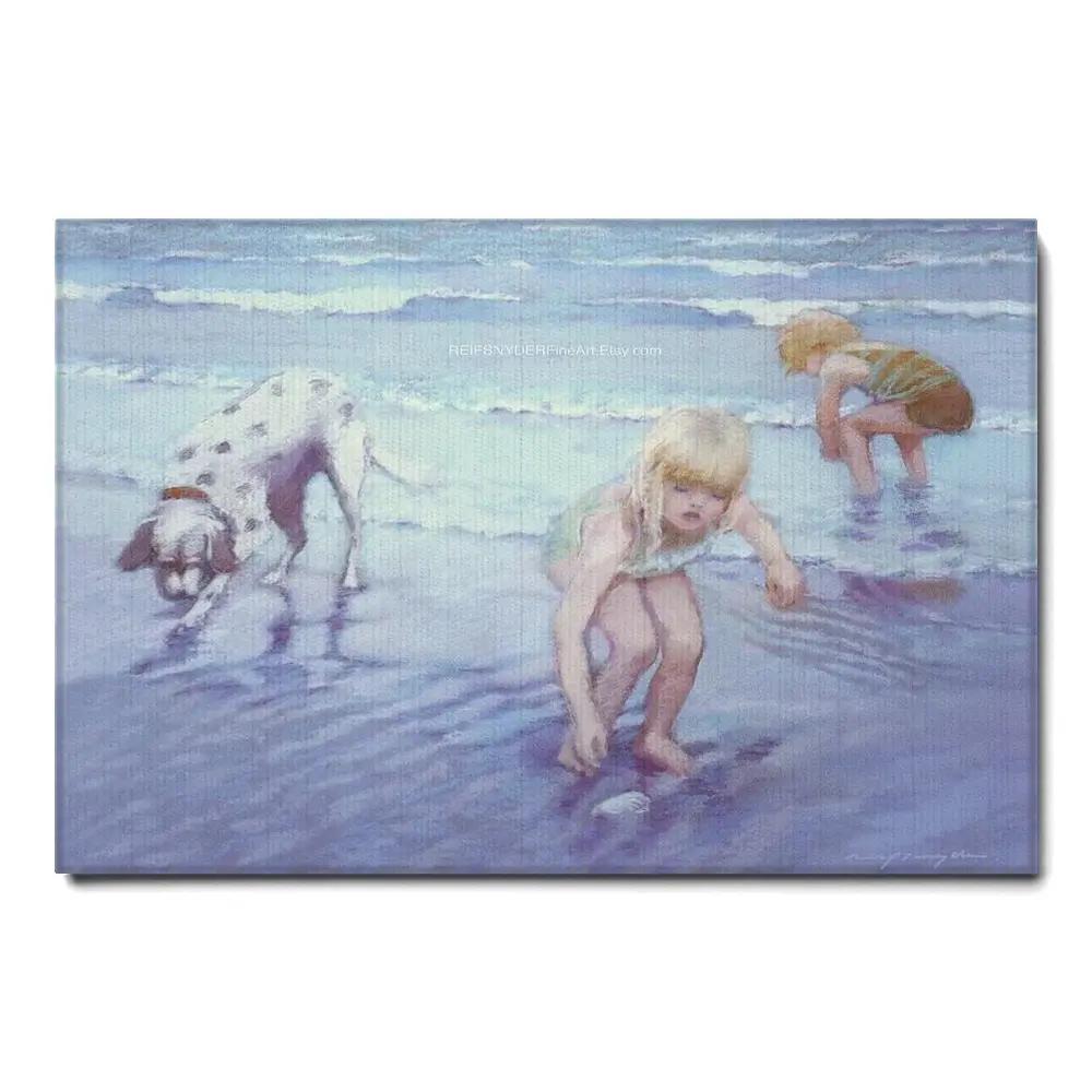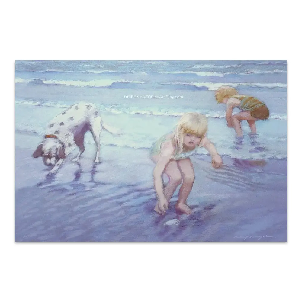 Boy And Girl Dog Beach Print Beach Scene Two Children Seashore Brother And Sister Ocean Blue Collecting Shells Shore