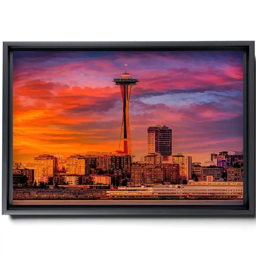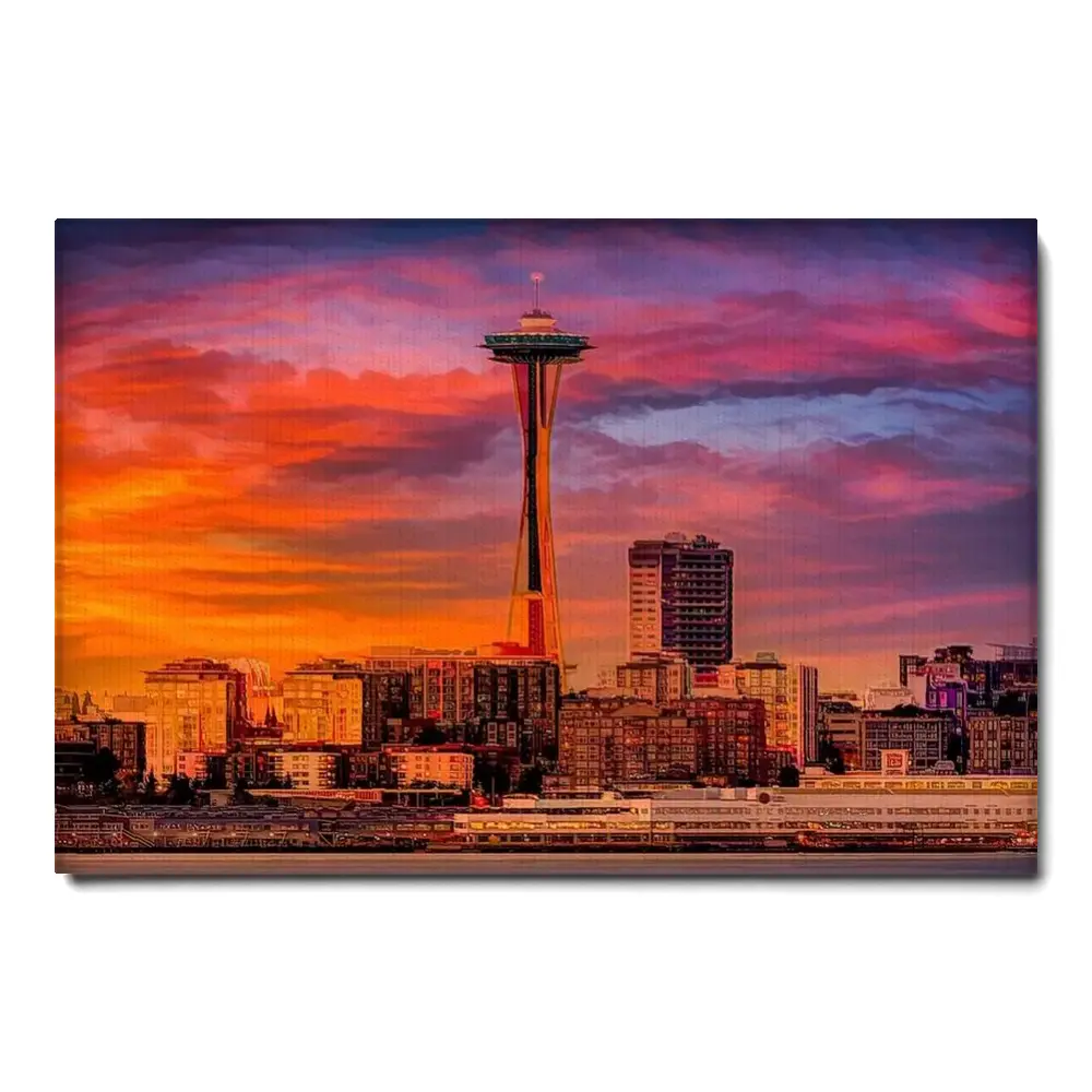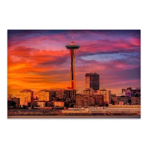 Colorful Seattle Skyline Abstract Photography Space Needle Iconic Sunset Wall Canvas Urban Cityscape Wall Decor Golden Hour