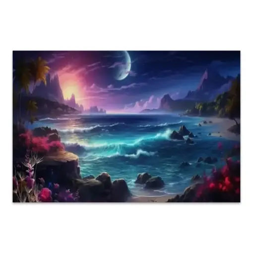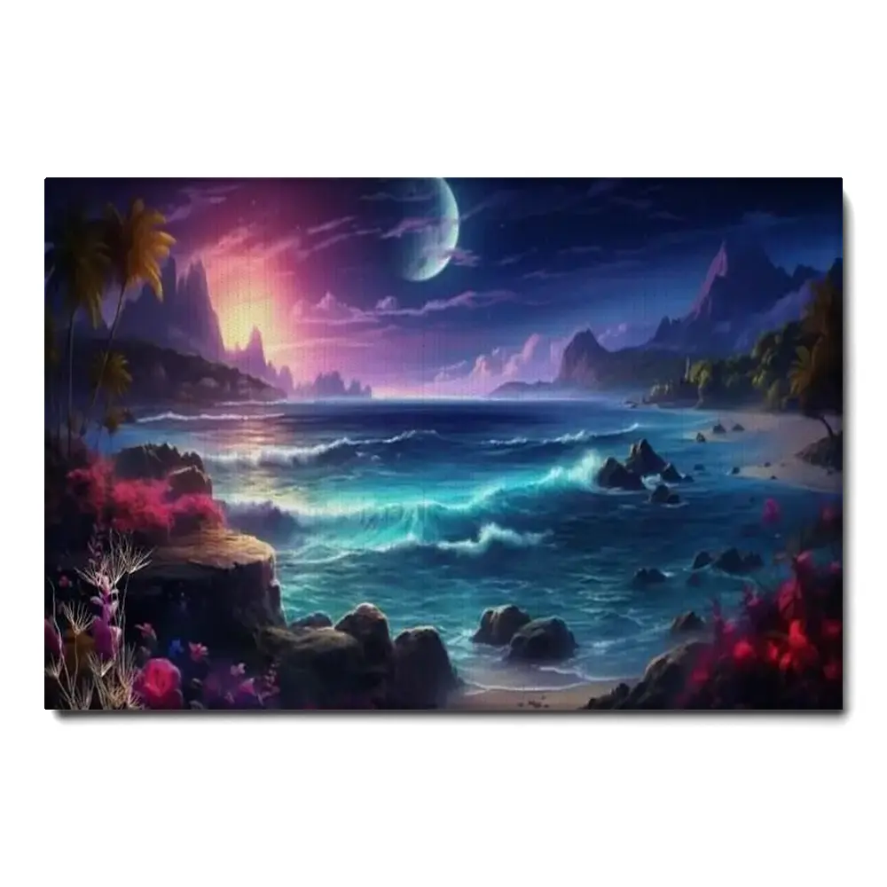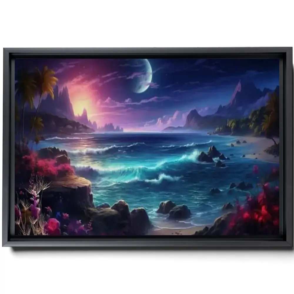 Purple Night Tropical Beach Painting Canvas Print Whimsical Bedroom Wall Art Living Room Decor Framed Ready To Hang