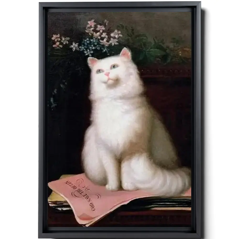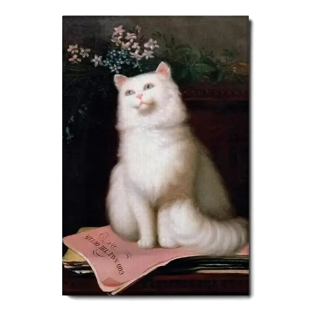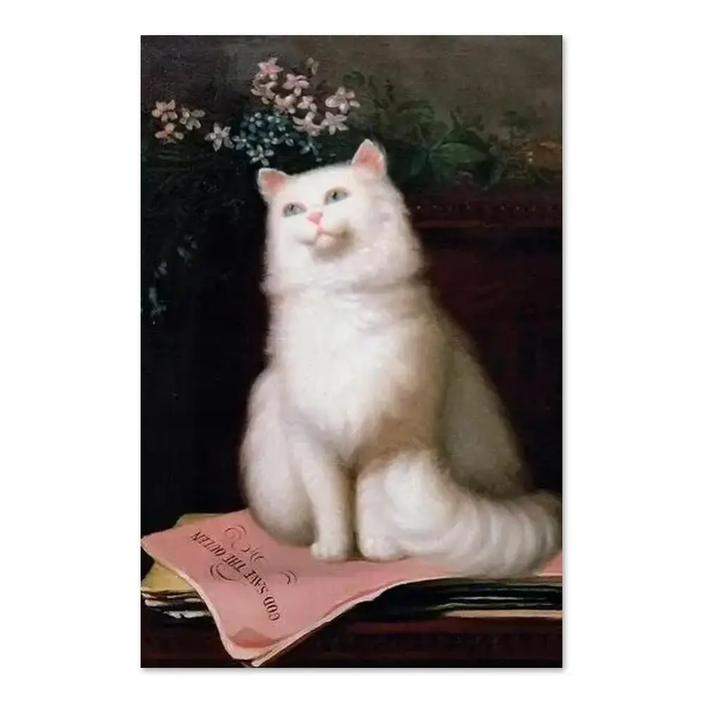 Rare Vintage Cat Poster God Save The Queen Classic White Cat Painting Cat Art Print Antique Cat Floral Print