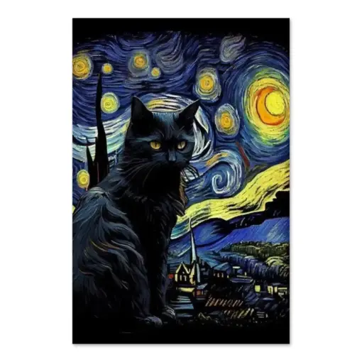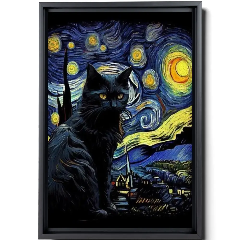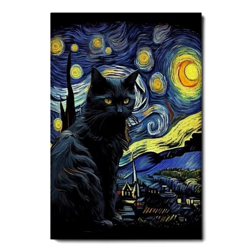 Starry Night Cat Painting Vincent Van Dog’s Art Canvas Print Starry Night With A Black Cat Funny Canvas Poster Wall Art Wall Decor