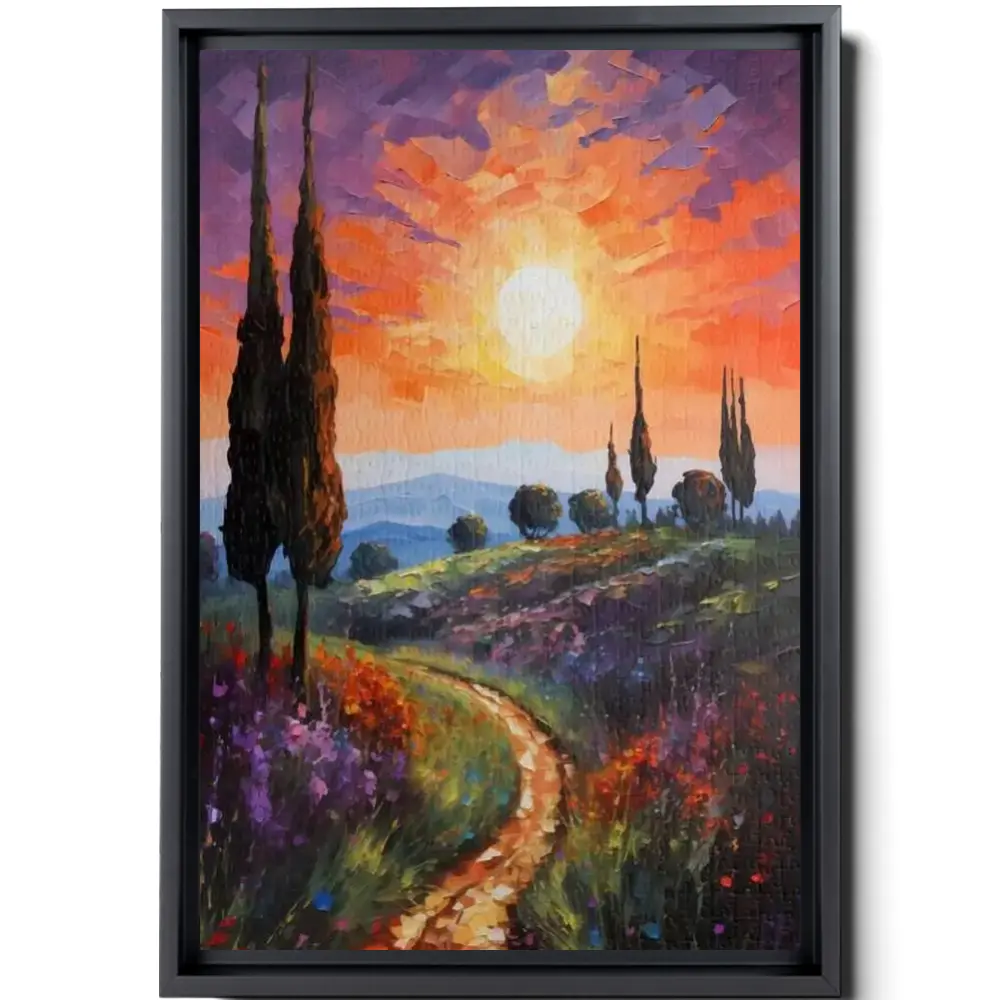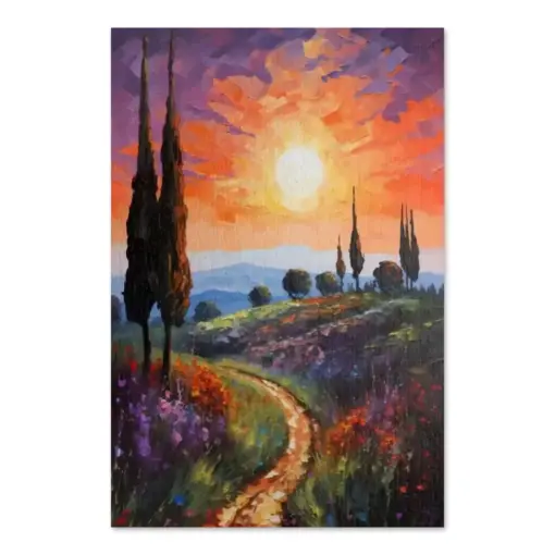 Be the first to review “Sunset Vista – European Countryside At Sunset Orange And Purple Glow Over A Tranquil Scene Impressionist Style Landscape – Nature Puzzle”
