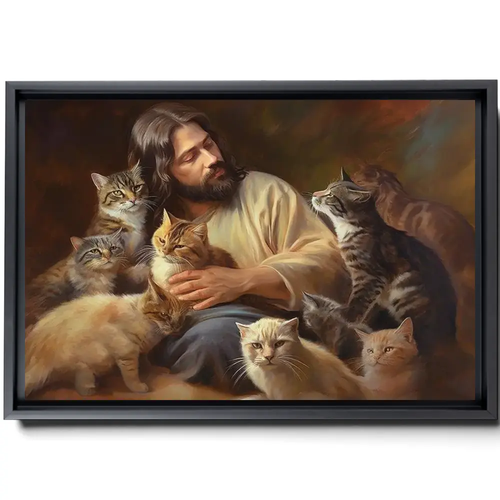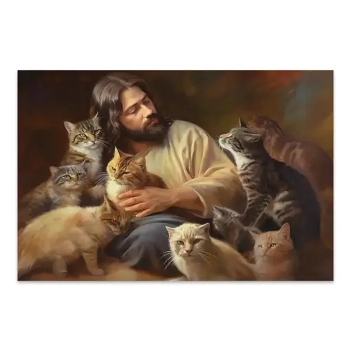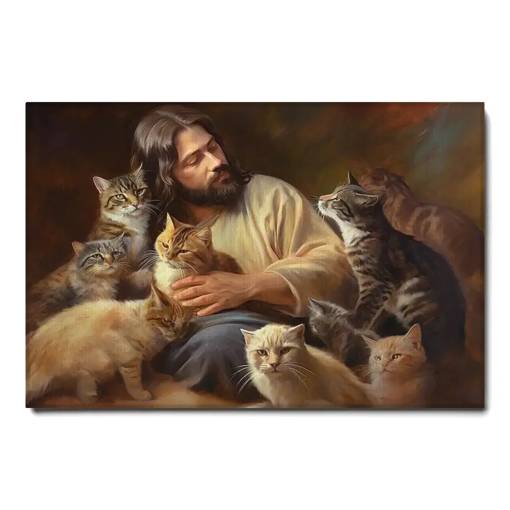 Vintage Jesus Loves Cat Canvas Wall Art Print – Catholic Poster Art Animal Artwork Wall Hanging