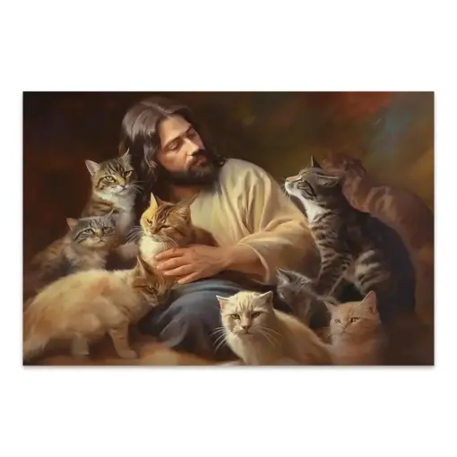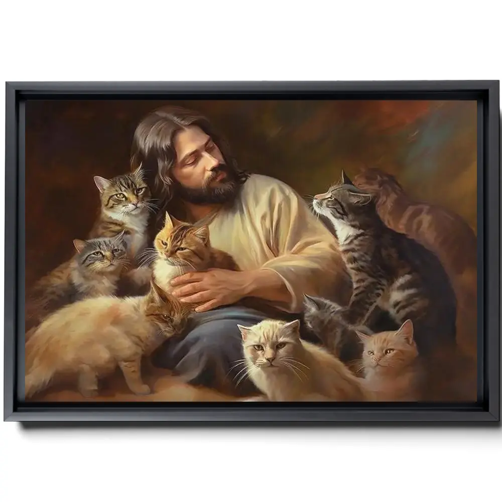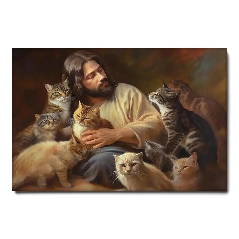 Vintage Jesus Loves Cat Canvas Wall Art Print – Catholic Poster Art Animal Artwork Wall Hanging