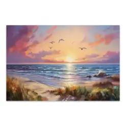Colorful Beach At Sunset With Seagulls Painting Canvas Print – Coastal Pink Blue Wall Art Framed Framed Ready To Hang